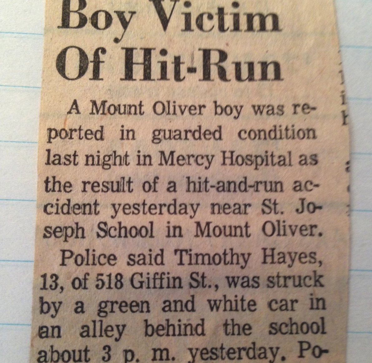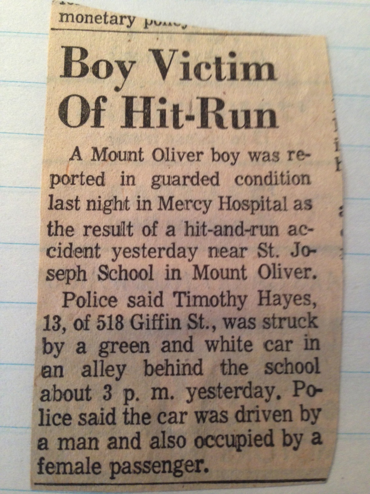 You won’t remember my face, I’m sure, but if you saw me today the same way you did on that March afternoon in 1974 – as I sailed 15 feet into the air, after being launched by the front end of your speeding green Caddy – it might sufficiently jog your memory.