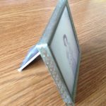 Purchased in 1978 at an Authenreith’s 5&10, this frame sits beside my Mac screen as I write this essay today. It still has some of the glue residue from the not-so-carefully-removed price tag in the upper-right corner. The little cardboard stand in the back, frayed and worn, still holds the picture upright. Old Scotch-tape patches along the base help hold the thing together. Even the gold trim has dulled to a degree.