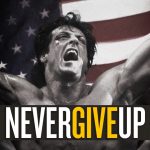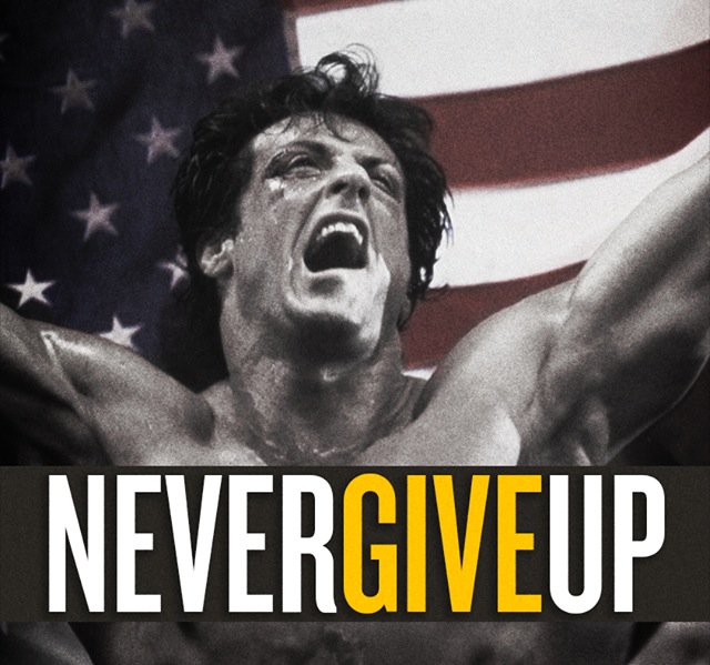 A piece of paper, sent through my printer weeks ago, shows a picture of my favorite movie character, Rocky Balboa, crying out in glorious, star-spangled victory. The headline next to it reads, “Never Give Up.”